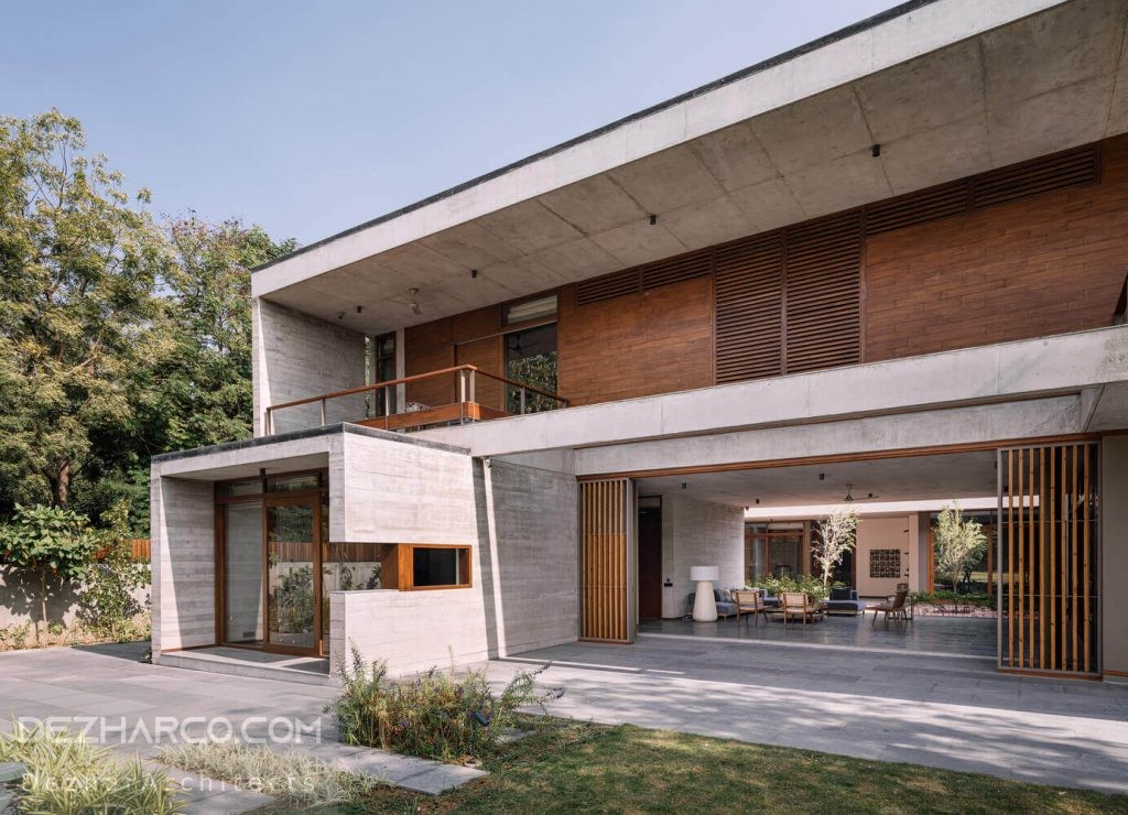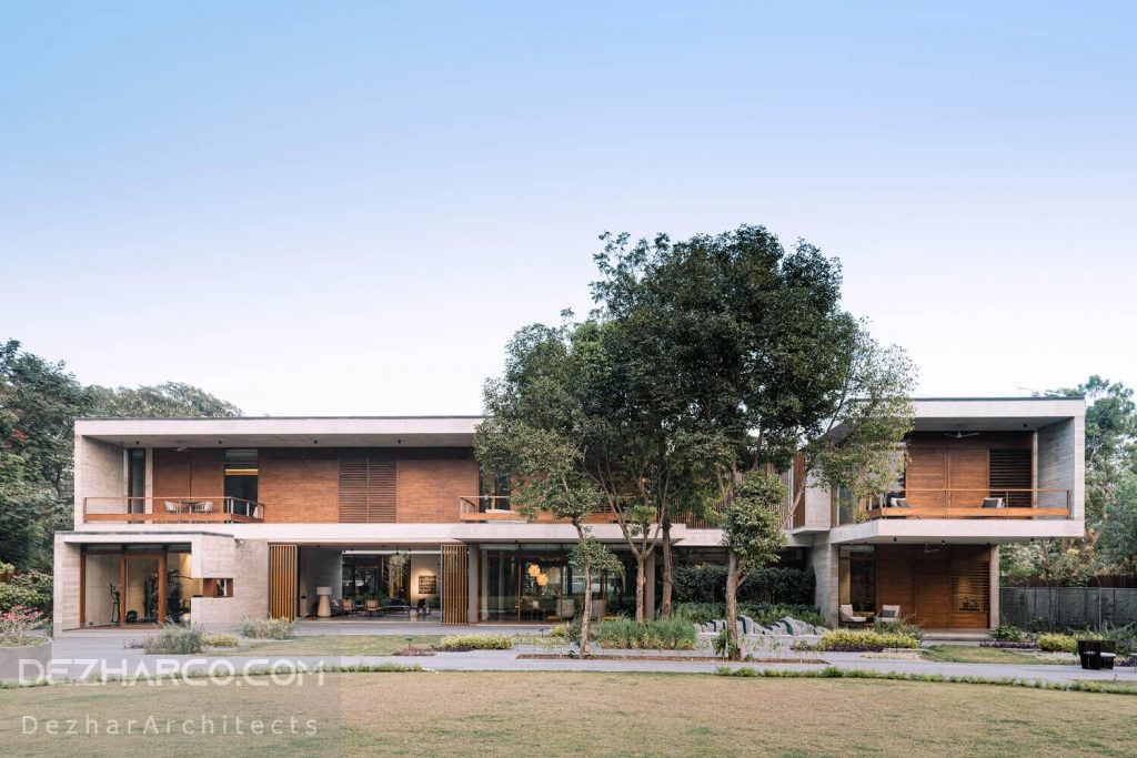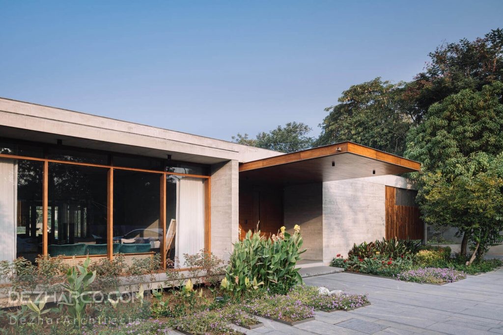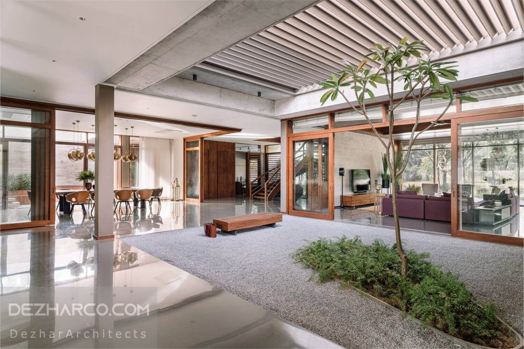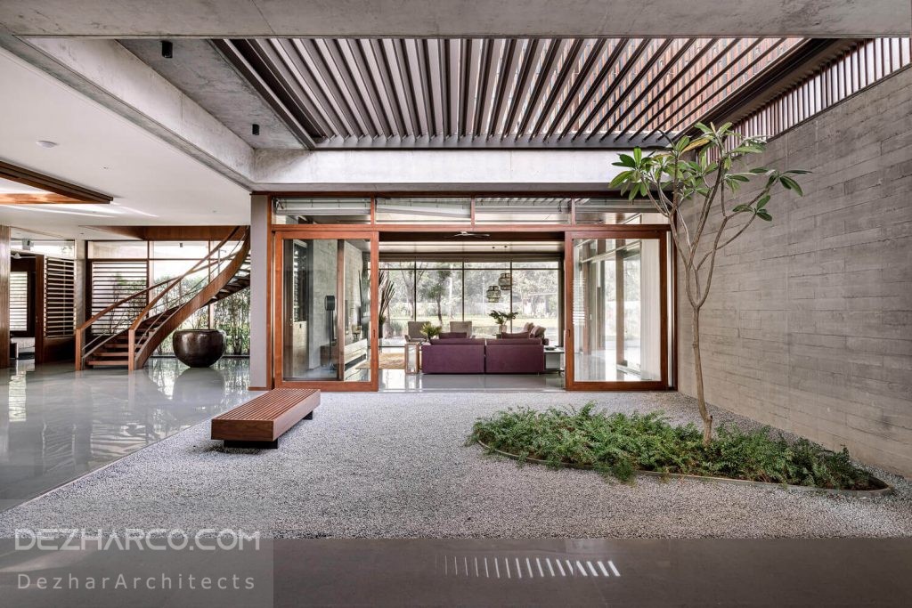 حیاط داخلی و خارجی روح ویلا است و چیدمان آن در اطراف این ها مرتب شده است. معرفی این حیاط های دوتایی که بخش جلو و عقب ویلا را از هم جدا می کند ، به دلیل نگرانی های امنیتی و اقلیمی از جنبه های چالش برانگیز این طرح بود. بخش داخلی که فضای خاص و سبز است و به محل زندگی ، ناهار خوری و … آن باز می شود ، باید مسائل امنیتی ، باران و گرد و غبار را حل کند.برای حل این نگرانی در مورد امنیت و حریم خصوصی در طراحی ویلا مدرن احمداباد، از طریق صفحه های رفت شد.