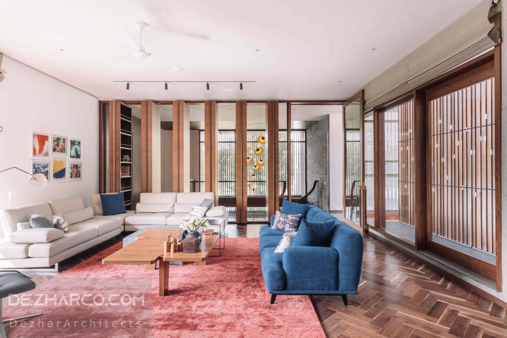 جدا از این ، ما لورهای قابل کار با چوب را معرفی کردیم که می تواند در ساعات مختلف روز بسته و باز شود. محوطه بیرونی که بخش ورودی ، استودیوی کار و ایوان باز می شود ، به آسمان باز نگه داشته می شود اما دارای صفحه های کشویی چوبی در سمت باغ است که می تواند در شب برای اهداف امنیتی بسته شود در حالی که صفحه چوب نسیم را به این فضاها می دهد. در فضاهای مشترک پایین پنجره های شیشه ای برای ارتباط با فضای باز وجود دارد در حالی که اتاق های خواب دارای لوورهای چوبی و صفحات چوبی برای افزایش حریم خصوصی و همچنین عایق بندی این اتاق ها از گرمای شدید از سمت غرب است.