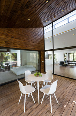 ۳- در این پروژه سعی در به کارگیری فضاهایی نیمه باز و باز در درون پروژه و کشیدن محیط اطراف به درون فضای زندگی بود که این امر توسط فضاهای نیمه باز و کاملا باز انجام شد. فضای نیمه باز در این پروژه به صورت یک فضای خالی از مکعب حجمی ساختمان در طبقه اول دیده شد که ارتباط بصری را رو به دریاچه فراهم کرده و همچنین امکان دسترسی به فضای باز رو به دریاچه و نشیمن خصوصی و اتاق اصلی ویلا را فراهم نماید. فضای دیگری که در این ویلا تعریف شد یک سطح کاملا باز رو به دریاچه بود که از طریق یک پل به فضای نیمه باز داخل حجم متصل شد که  این فضا در جهت استفاده از دید مستقیم دریاچه تعریف گردیده است.