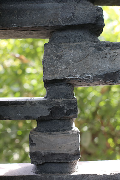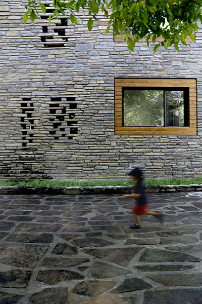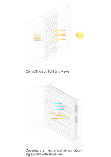 متریال سنگ در آنجا ابزاری برای تشدید کیفیت ادغام شده با طبیعت در بیرون و درون پروژه بود به گونه ای که سنگ ها با طبیعت خود ولی با نظم افقی شکل گرفته و در قسمت هایی که مانند سرویس ها و فضاهای فرعی دید و نور کمتری احتیاج بوده،  سنگ ها به صورت متخلخل شکل گرفته اند و این مسئله باعث شد که علاوه بر یکپارچگی نمای بیرون، در داخل فضا نیز امکان استفاده از نمای سبز درختان باغ را داشت. از این روش برای ورود هوا و ایجاد دریچه های تاسیسات در داخل دیوارهای سنگی نیز استفاده شد.