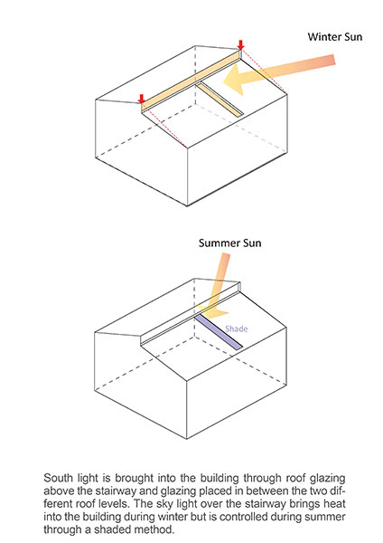 ۱-  ایجاد بازشوهایی برای استفاده از نور جنوب خورشید و کشاندن حرکت نور از طریق لایه های شفاف مختلف در داخل به گونه ای که کیفیت طیف نوری در داخل فضا بر اساس حرکت خورشید تغییر نماید. یکی از بازشوها در سقف پروژه و بالای پله اصلی داخلی شکل گرفت که نقش گرمایشی را در زمستان برای فضای داخلی بازی کرده و در تابستان نیز یک شید در بیرون آن قرار گرفته که ورود نور را به داخل کنترل کند.