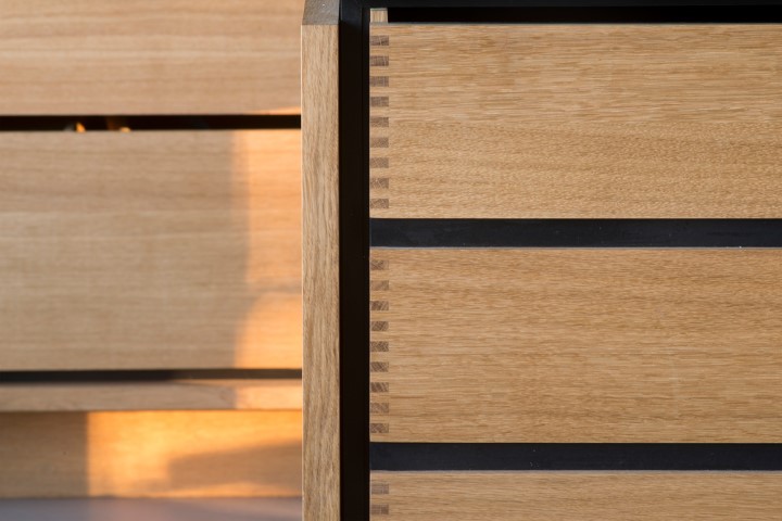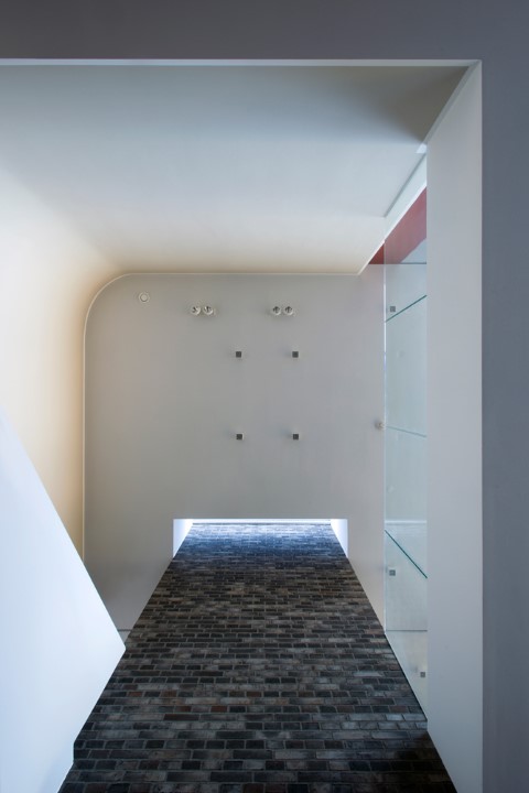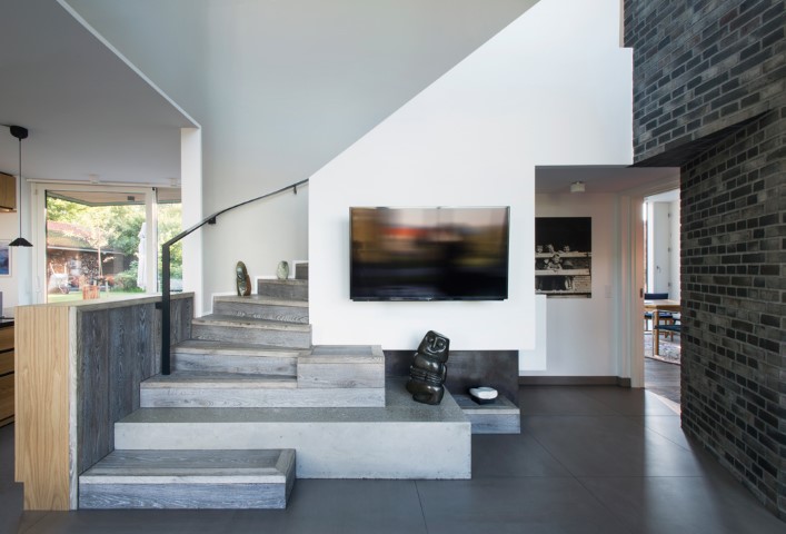 تایلهای بزرگ کف از جنس چوب بلوط رنگ شده، تجهیزات اشپزخانه دست ساز و آجر سوخته با رنگ های روشن و سبک خانه تعادل برقرار می کنند و بافتهایی را شکل می دهند که بر نور متغیر داخلی تاکید می کند. نزدیکی خانه به محوطه سبز اطرافش با پنجره های کف تا سقف سخاوتمندانه و انتقال سیال بین درون و بیرون تکمیل شده است.