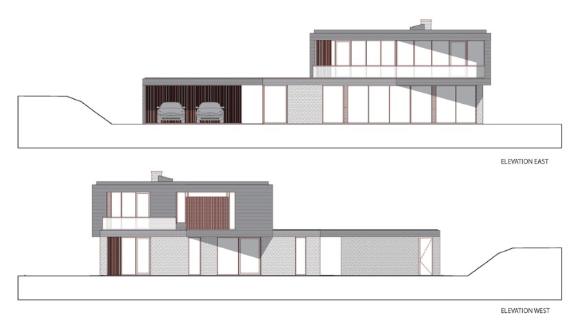 طبقه همکف و اول به شکل دو متوازی الاضلاع وارونه اند که مجموعه ای وسیع از تراس های باز و نیمه پوشیده در هر دو سطح است که با روی پتینه کاری شده قاب گرفته می شود.